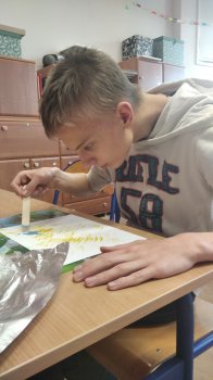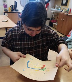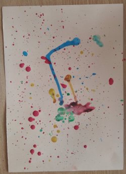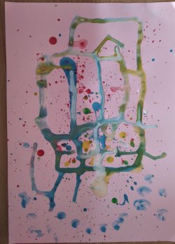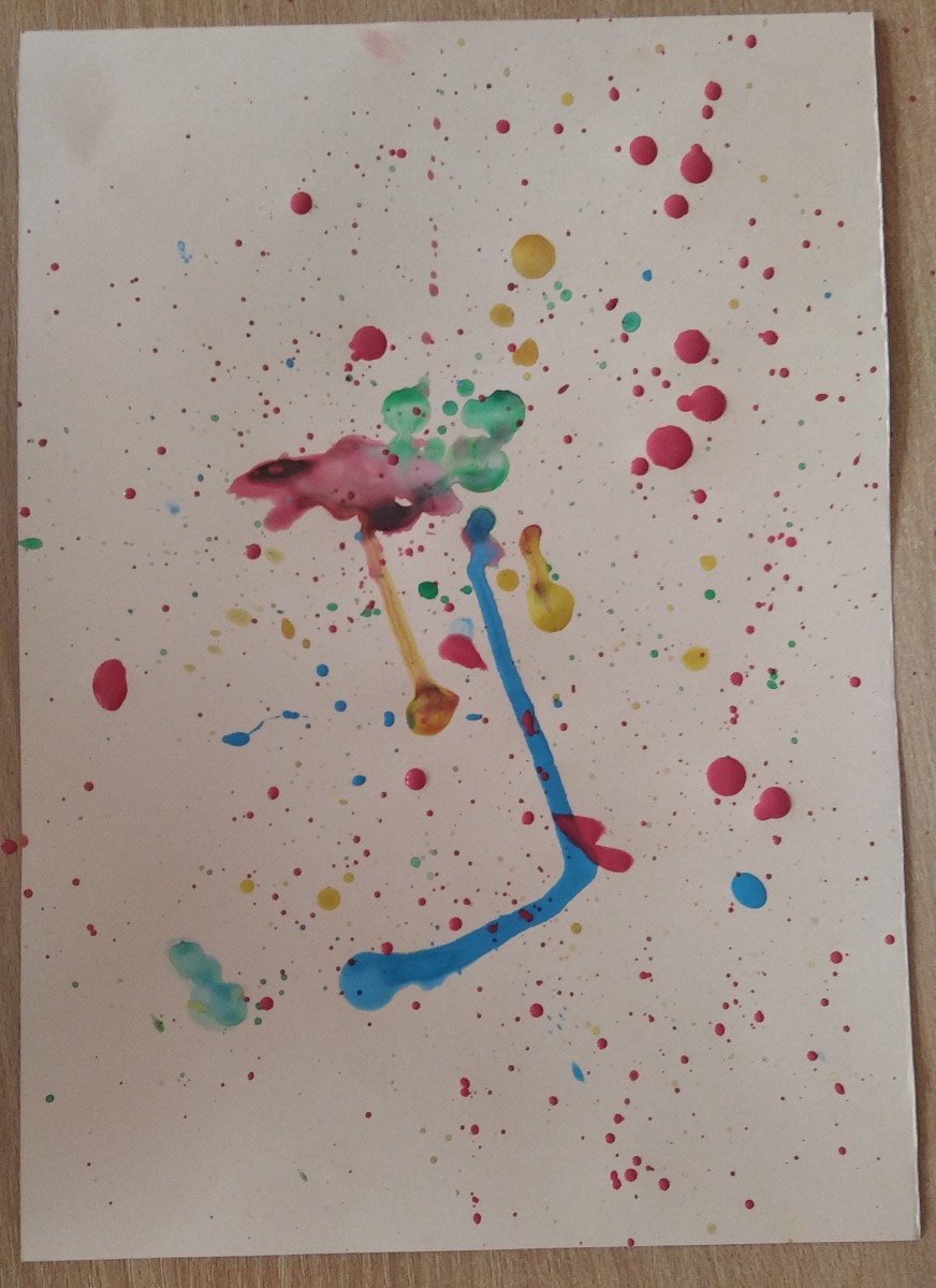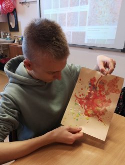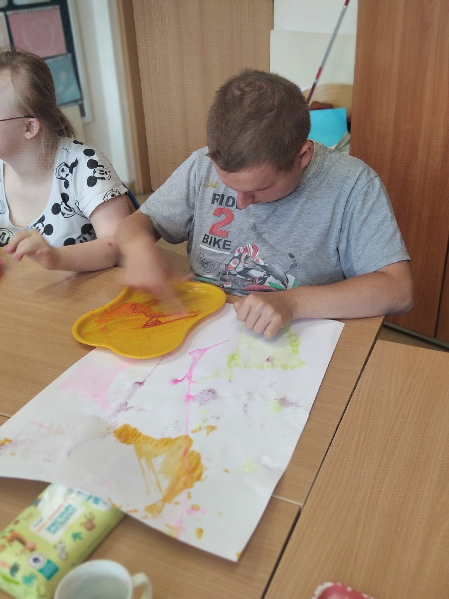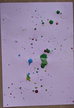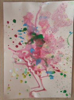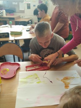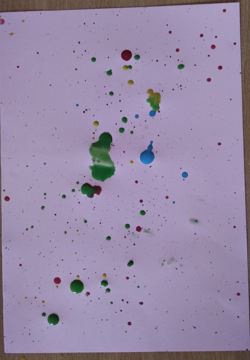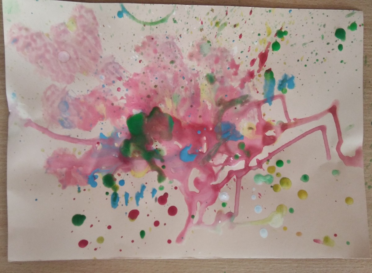 Podczas wykonywania tego zadania doskonale bawiliśmy się: "strzelając" farbami z pędzli, rozlewając farby na kartkach, malując obrazy, poprzez poruszanie kartkami tak, aby krople farby zostawiały na nich swoje ślady.