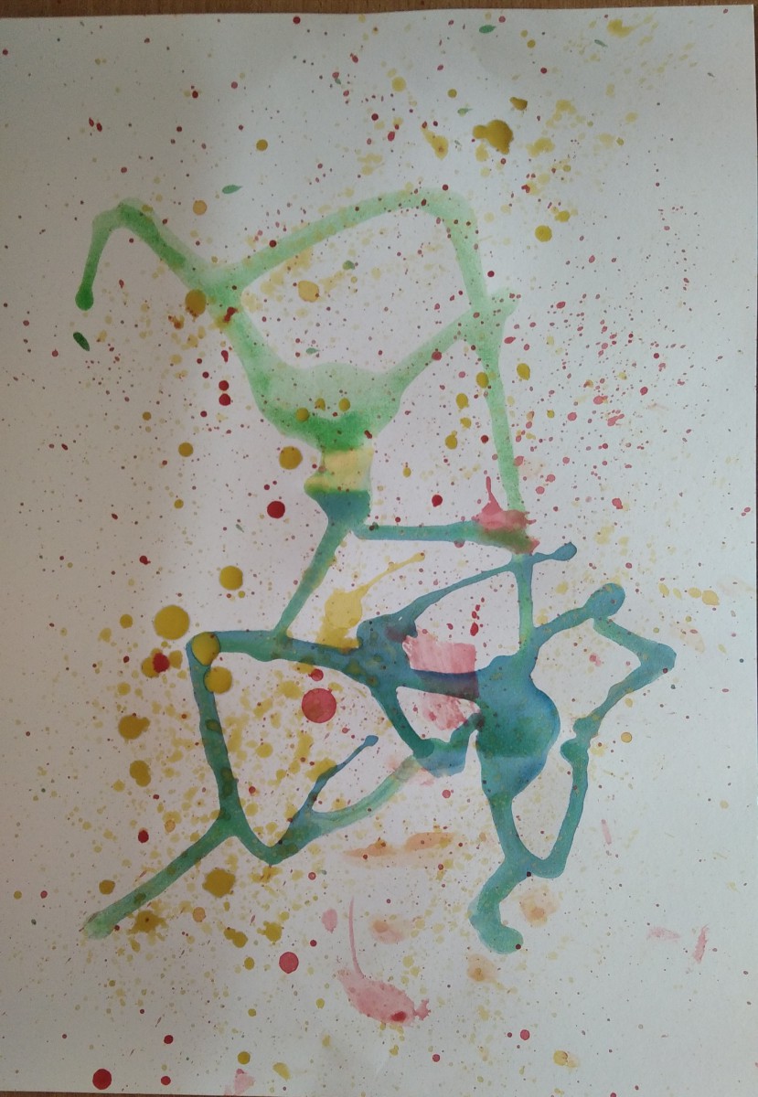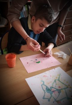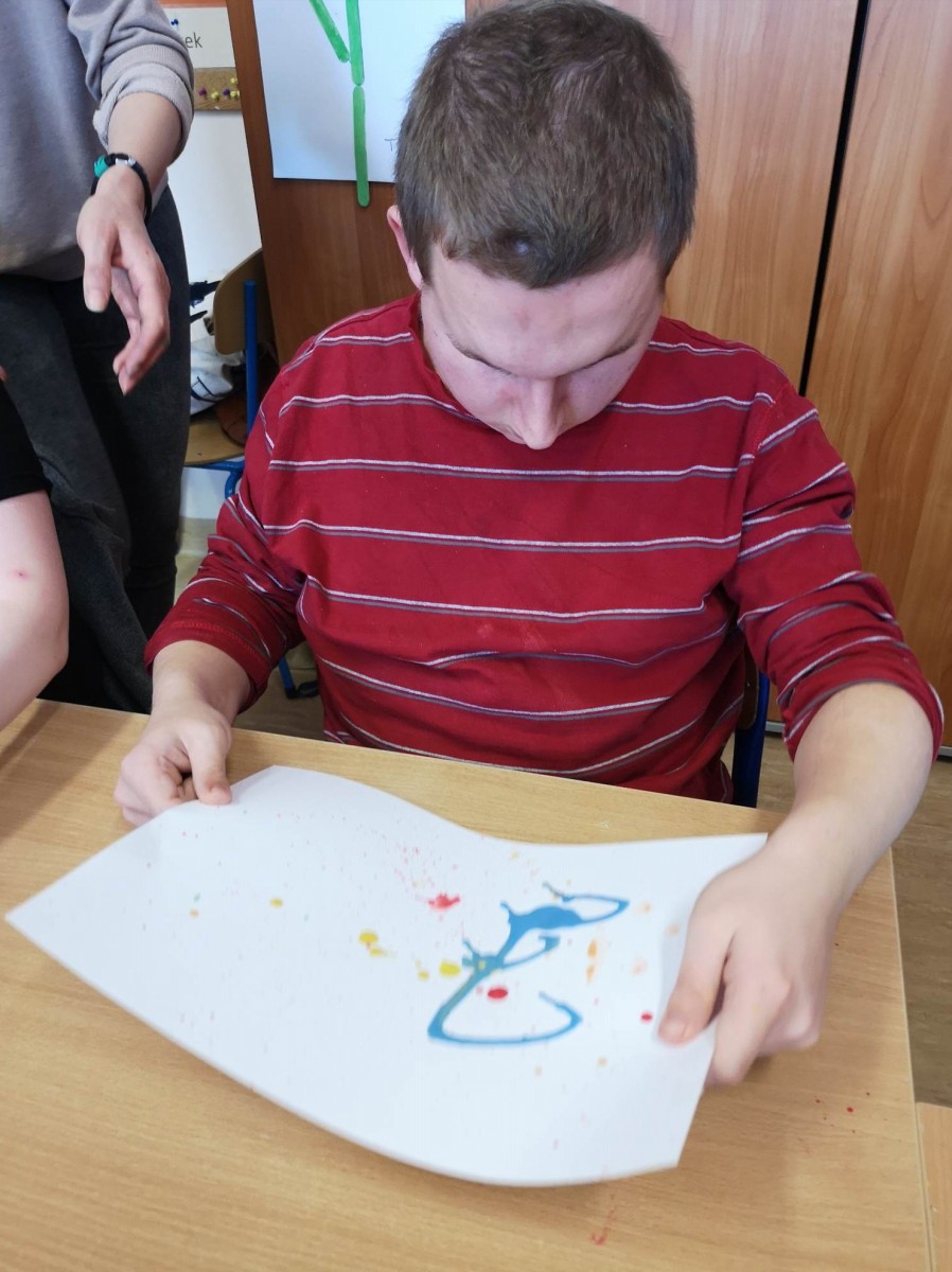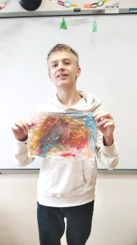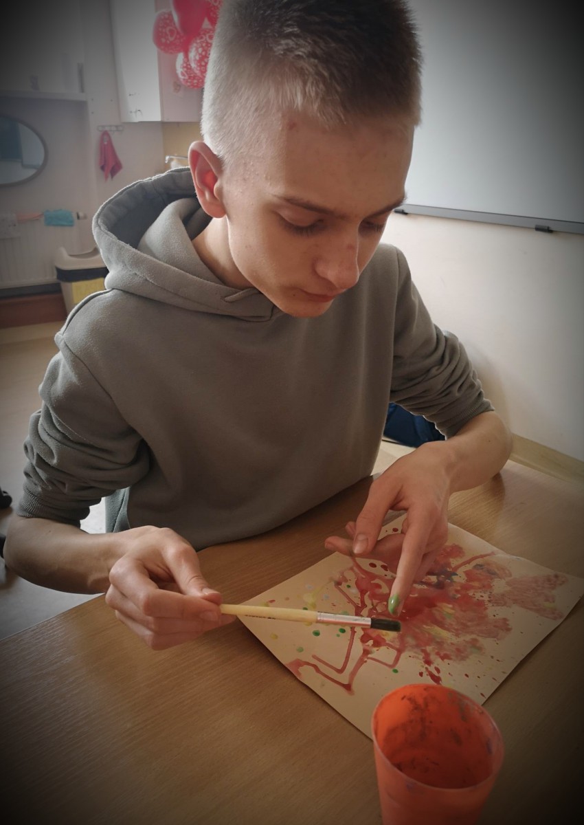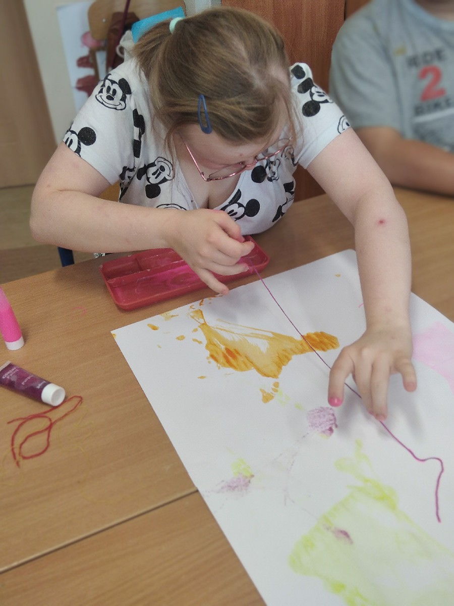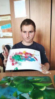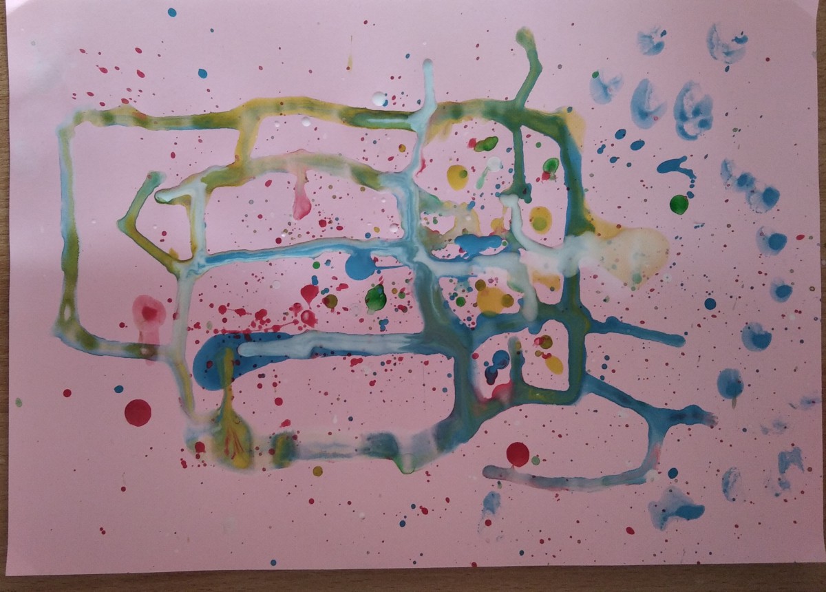 Podczas wykonywania tego zadania doskonale bawiliśmy się: "strzelając" farbami z pędzli, rozlewając farby na kartkach, malując obrazy, poprzez poruszanie kartkami tak, aby krople farby zostawiały na nich swoje ślady.