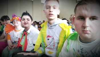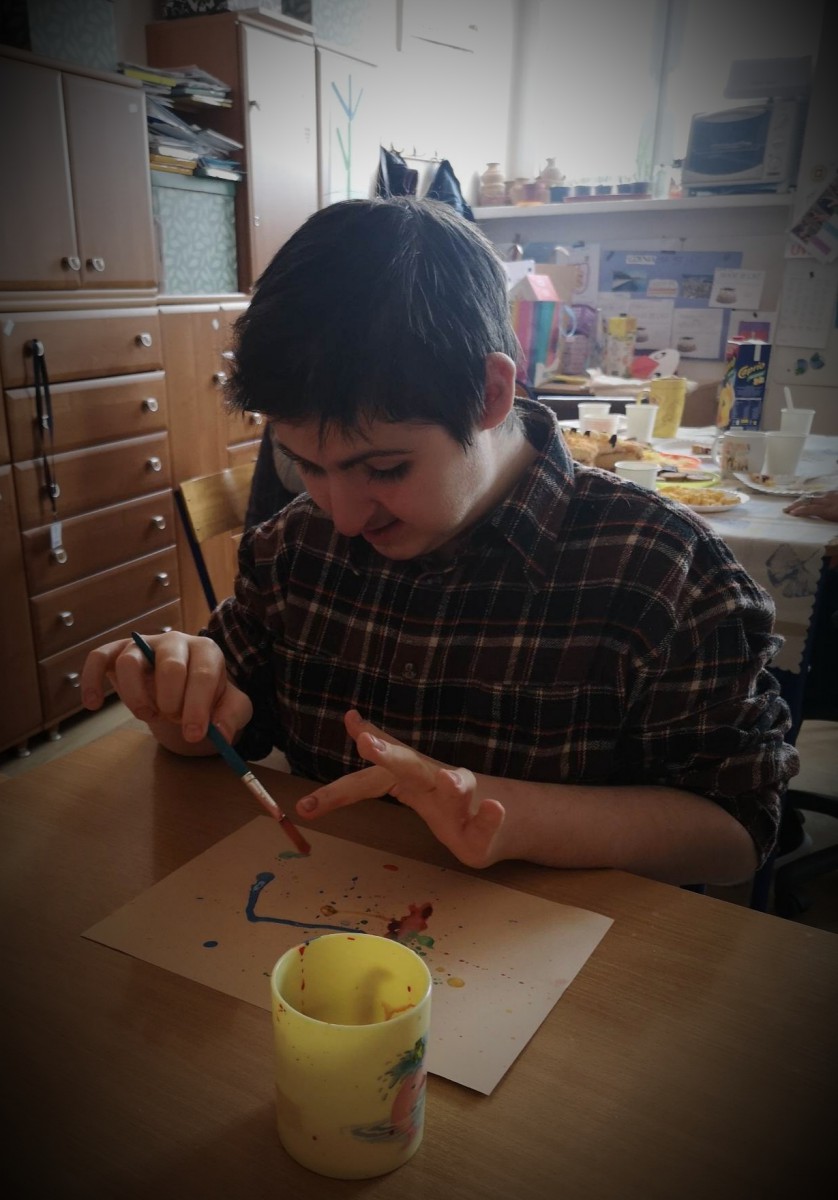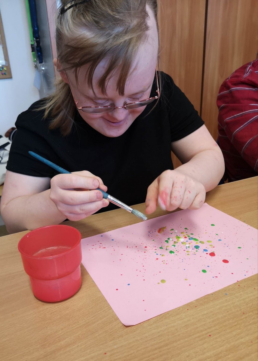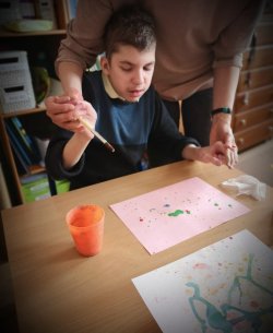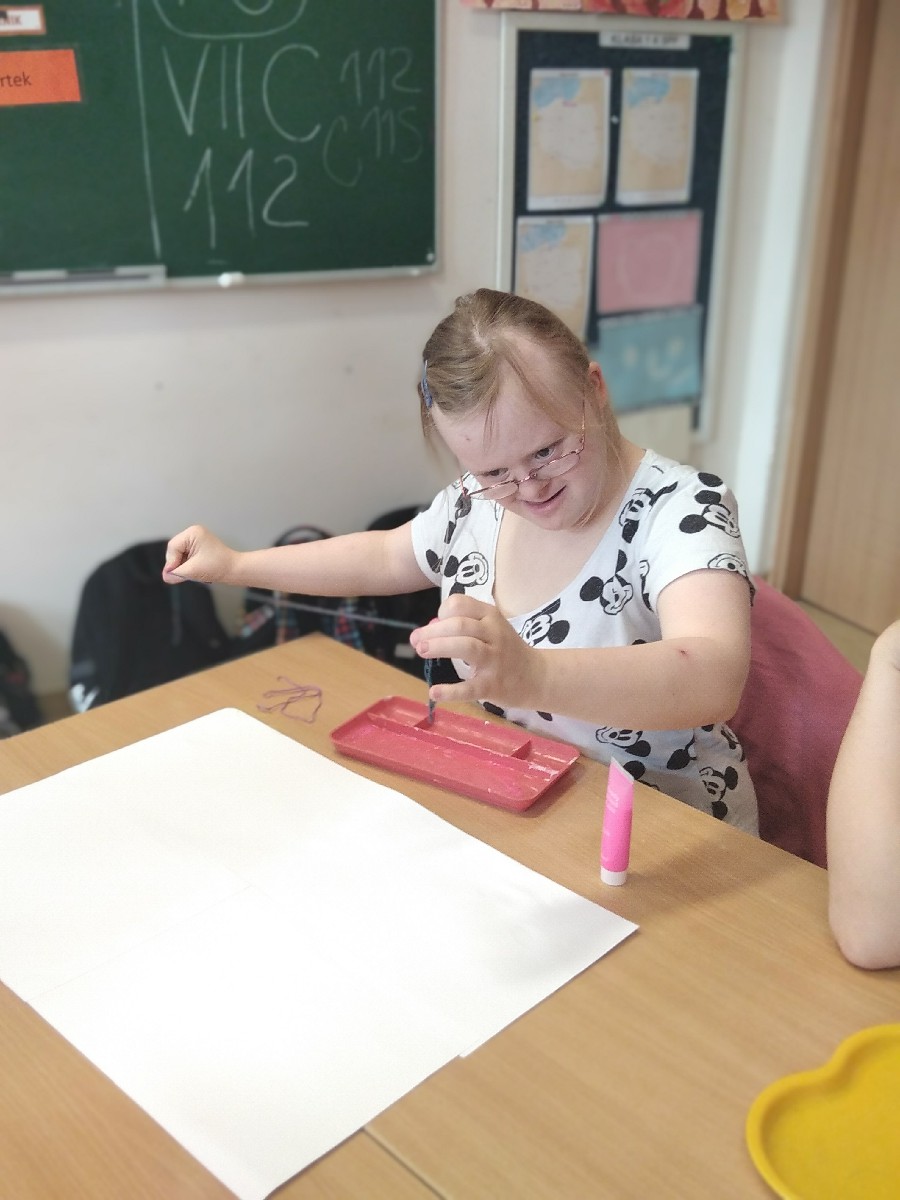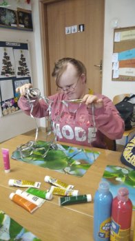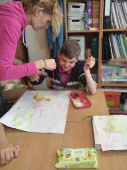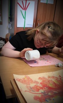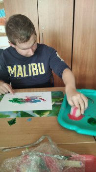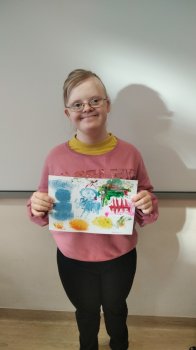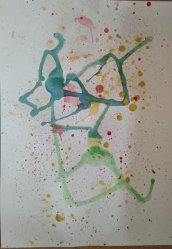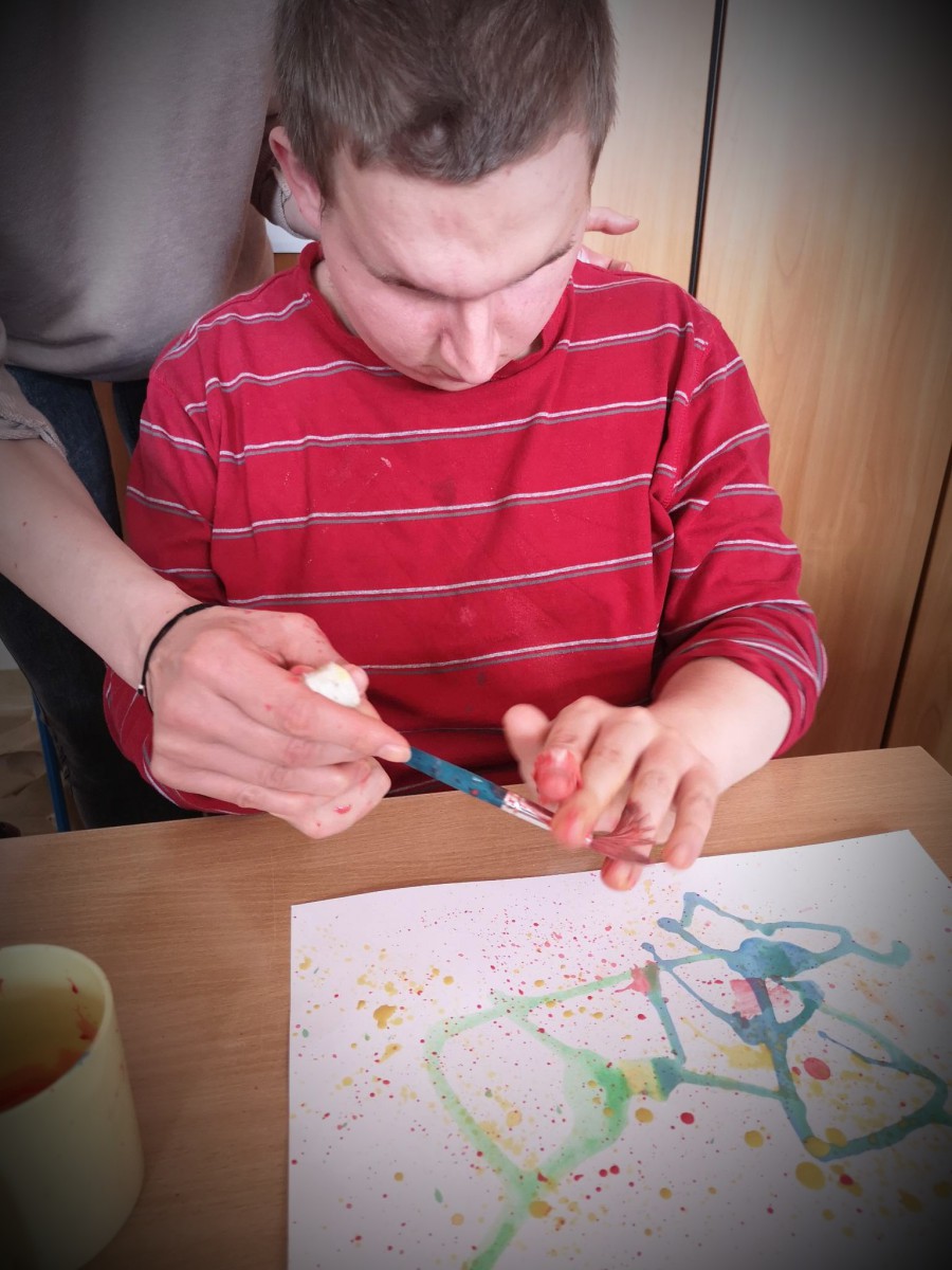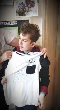 Podczas wykonywania tego zadania doskonale bawiliśmy się: "strzelając" farbami z pędzli, rozlewając farby na kartkach, malując obrazy, poprzez poruszanie kartkami tak, aby krople farby zostawiały na nich swoje ślady.