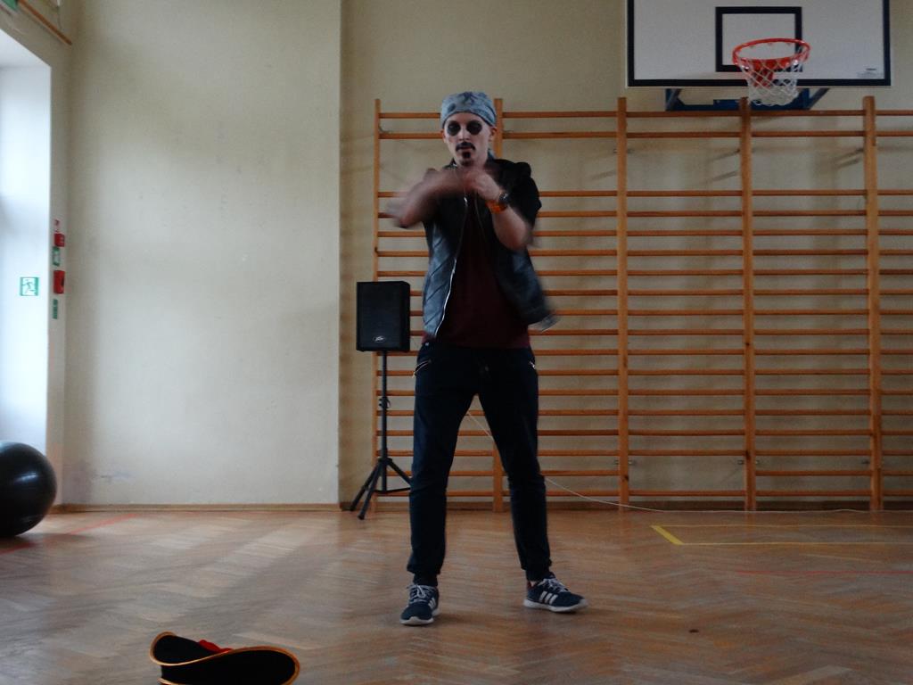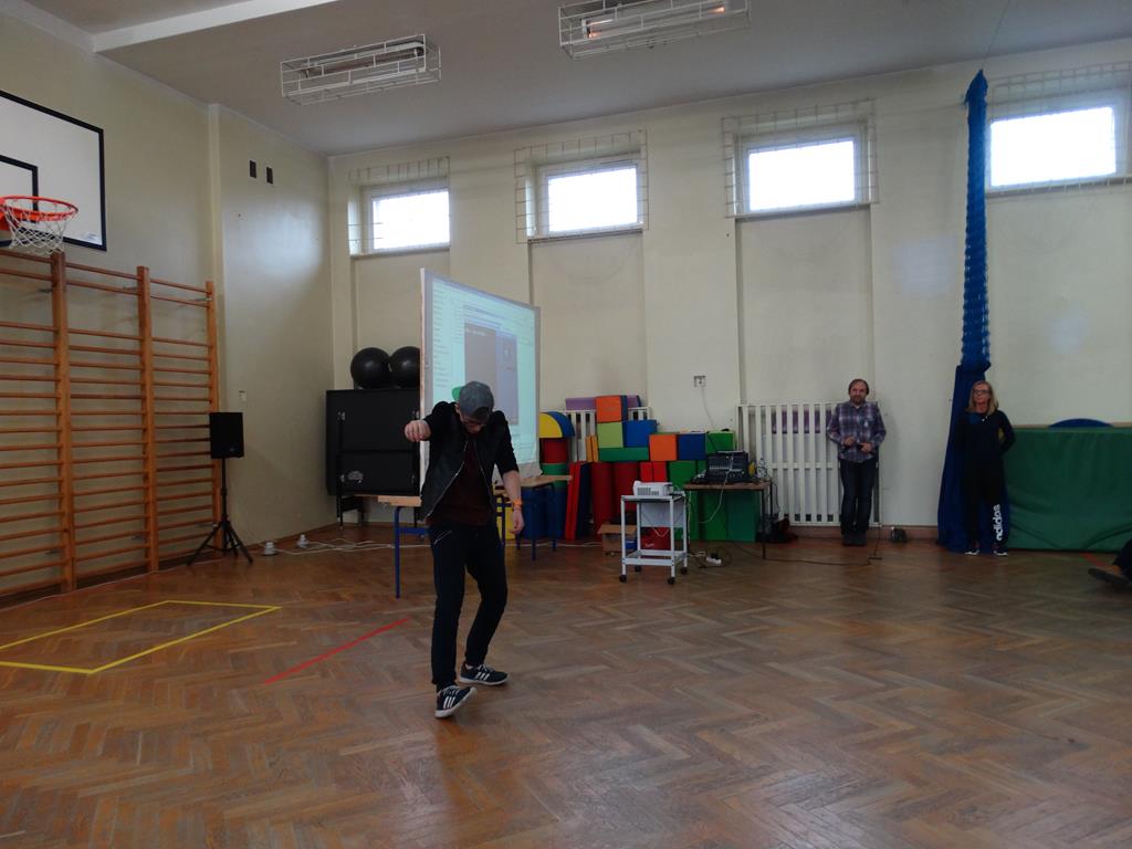 Podczas spotkania dowiedzieliśmy się że Piotrek jest "samoukiem" jeśli chodzi o taniec. Początkowo obserwował innych tancerzy po czym próbował różnych ruchów i figur przed lustrem. Aktualnie wymyśla i aranżuje swoje układy które są całymi opowieściami na różne tematy. Mogliśmy się również przekonać jak trudny jest prezentowany styl tańca próbując naśladować pokazane przez Profcia ruchy. Uczniowie mieli też możliwość zadania mu pytań na które otrzymali wyczerpujące odpowiedzi.