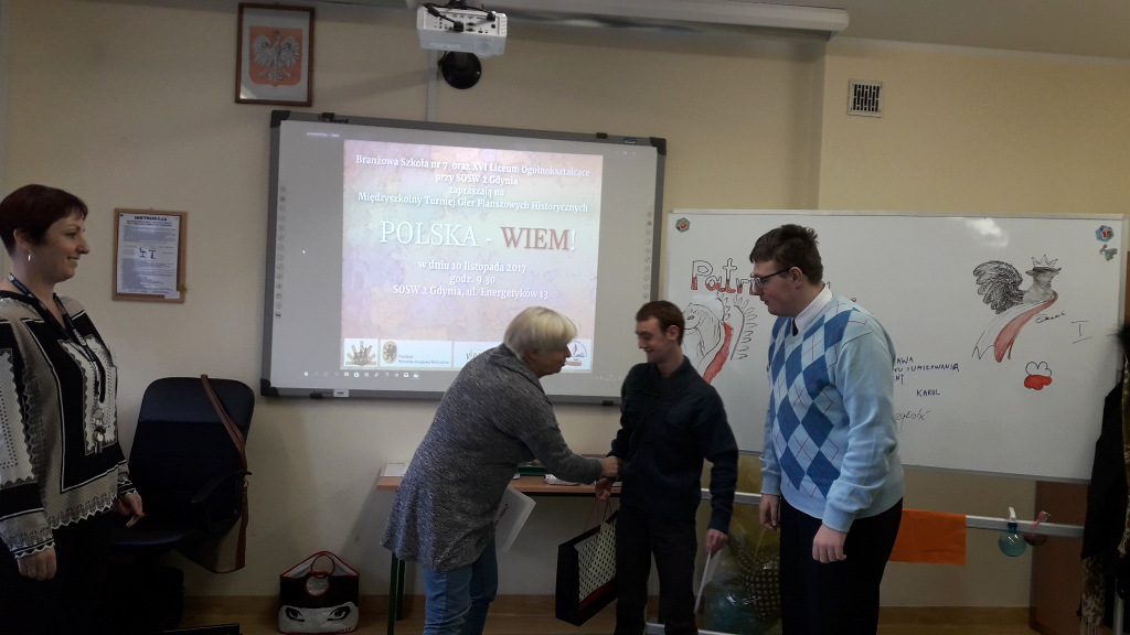 10 listopada 2017 uczniowie klasy II A i II B gimnazjum Karol Godzina i Szymon Tekiela wzieli udział jako drużyna reprezentujaca SOSW nr 1 w Międzyszkolnym Turnieju Gier Planszowych "Polska wiem" . Na terenie SOSW nr 2 w Gdyni Uczniowie walczyli o punkty podczas Quizu z historii Polski oraz "Kolejki". Nowością były gry "Carcassonne" oraz "Scrabble historyczne" . Pierwsza gra polegała na wspólnym budowaniu z niewielkich żetonów łąk twierdz całych miast i dróg. Uczestnicy rywalizowali między sobą o przejęcie kontroli nad co bardziej atrakcyjnymi lokacjami. Wygrywał ten uczestnik który sprytne potrafił pozbawić rywala możliwości ukończenia ogromnego miasta lub przejmował kontrolę nad jego wielką łąką.