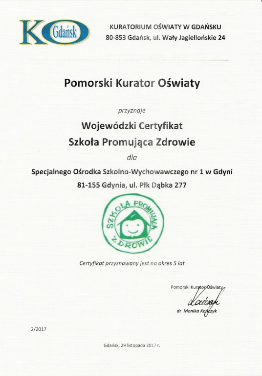 Dnia 29 listopada 2017r. podczas konferencji "Zdrowie psychiczne dzieci i młodzieży współczesne zagrożenia" w Gdańskim Uniwersytecie Medycznym odbyło się uroczyste wręczenie Wojewódzkiego Certyfikatu "Szkoła Promująca Zdrowie". Dokument został wręczony Dyrektor SOSW nr 1 Pani Alicji Spica przez Pomorskiego Kuratora Oświaty Panią Monikę Kończyk.
