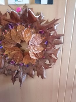 Pracę plastyczne "Jesiennewieńce na drzwi" wykonane z materiałów naturalnych przez uczniów klas VII i VIII SP i uczniów kład II i III SPdP pod kierunkiem Doroty Hippe.