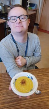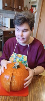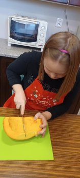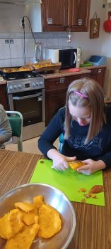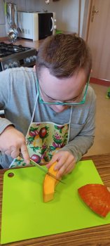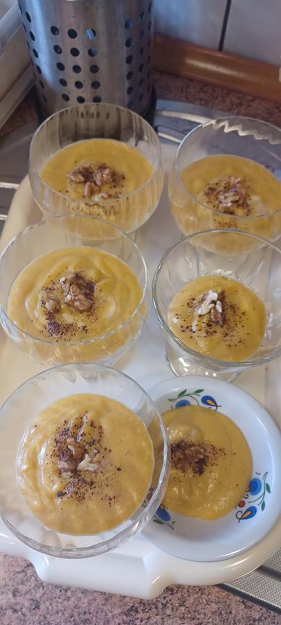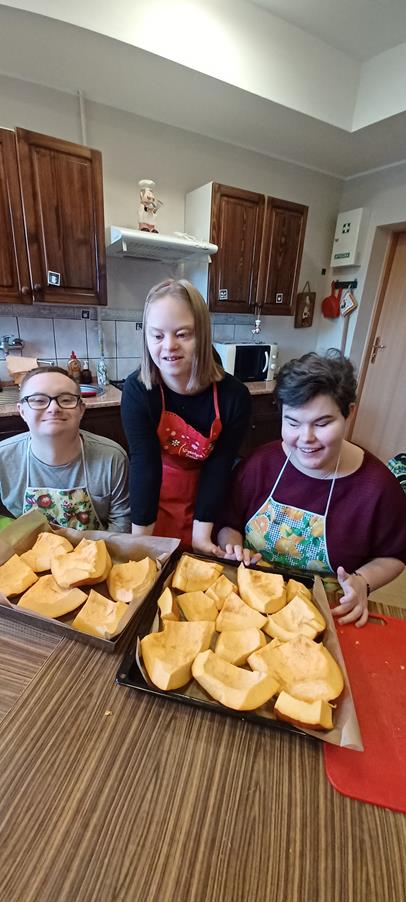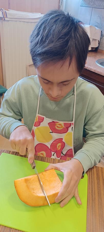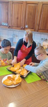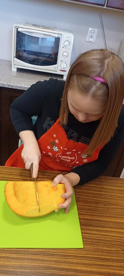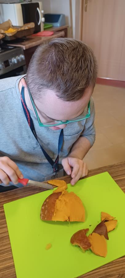 Uczniowie klasy III A SPP podczas zajęć przysposobienia do pracy w kuchni ćwiczeń, zgodnie z sezonem na dynie, przygotowali pyszny budyń dyniowy!