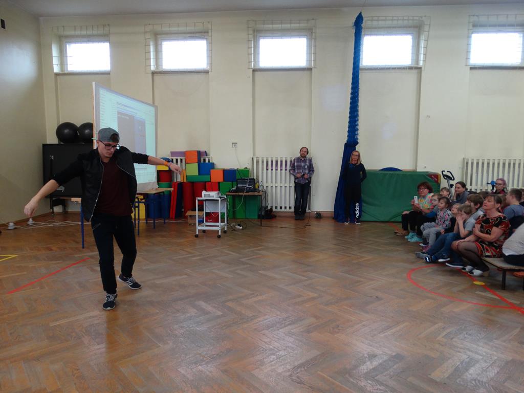 Podczas spotkania dowiedzieliśmy się że Piotrek jest "samoukiem" jeśli chodzi o taniec. Początkowo obserwował innych tancerzy po czym próbował różnych ruchów i figur przed lustrem. Aktualnie wymyśla i aranżuje swoje układy które są całymi opowieściami na różne tematy. Mogliśmy się również przekonać jak trudny jest prezentowany styl tańca próbując naśladować pokazane przez Profcia ruchy. Uczniowie mieli też możliwość zadania mu pytań na które otrzymali wyczerpujące odpowiedzi.