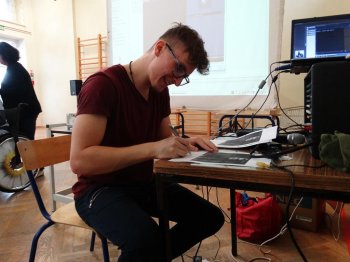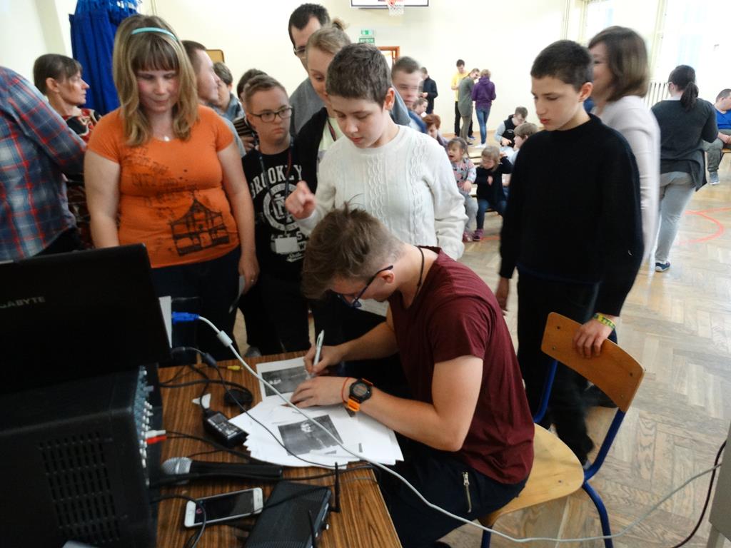 Piotrek zaprezentował nam dwa tańce można je obejrzeć na naszej stronie które na wszystkich zrobiły ogromne wrażenie. Pokazał kilka filmów na których tańczy w przeróżnych miejscach: na chodniku klatce schodowej w parku w domu i przed domem. Piotrek jest pomysłowy dowcipny ma ogromny dystans do siebie samego i do tego co robi. Jak się okazało podczas rozmowy taniec to nie jedyny talent naszego gościa zajął się on bowiem pisaniem książki. Jednak na efekt tej pracy będziemy musieli jeszcze trochę zaczekać.