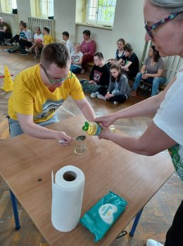 W dniu 25.05.2022r. odbył się w naszym Ośrodku ostatni już apel Szkoły Promującej Zdrowie z cyklu "Piramida zdrowego żywienia i aktywności fizycznej ". Uczniowie poznali grupę produktów znajdujących się na szczycie piramidy. Ponadto wzięli udział w konkurencjach związanych z danymi produktami. Na zakończenie ułożyli z dużych klocków przestrzenną piramidę i zostali poczęstowani zdrową, smakową wodą z miętą i cytryną.