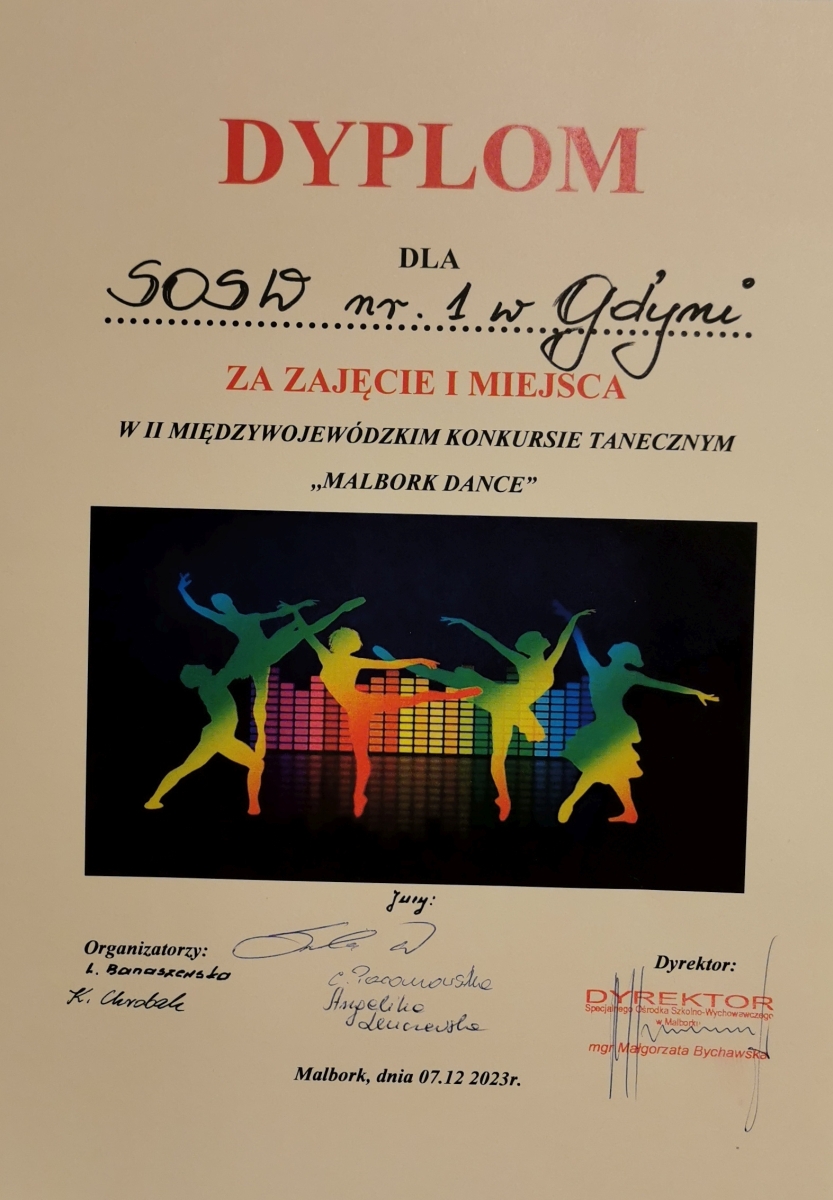 07 grudnia 2023 roku szkolny zespół taneczny „Papaya Dance” wziął udział w II edycji Międzywojewódzkiego Konkursu Tanecznego „Malbork Dance”. Podczas tegorocznych zmagań w Malborku zaprezentowało się aż 113 młodych tancerzy z dwunastu Placówek Kształcenia Specjalnego z województwa pomorskiego, warmińsko – mazurskiego i kujawsko – pomorskiego. Swoje umiejętności taneczne zaprezentowali artyści z: Bydgoszczy, Lidzbarka Warmińskiego, Gdyni, Gdańska, Wejherowa, Starogardu Gdańskiego, Kołozębia, Pelplina, Elbląga, Uśnic i Malborka.